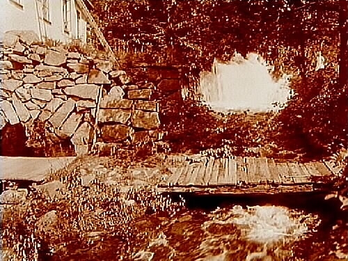 Envånings kvarnbyggnad med inredd vind och brutet tak. Damm och vattenfall.