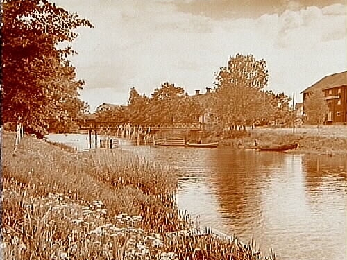 Bostadshus vid Kvismarekanal, gångbro över kanalen.