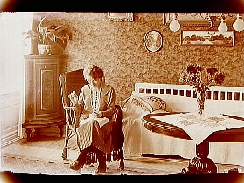 Rumsinteriör, en kvinna som syr.