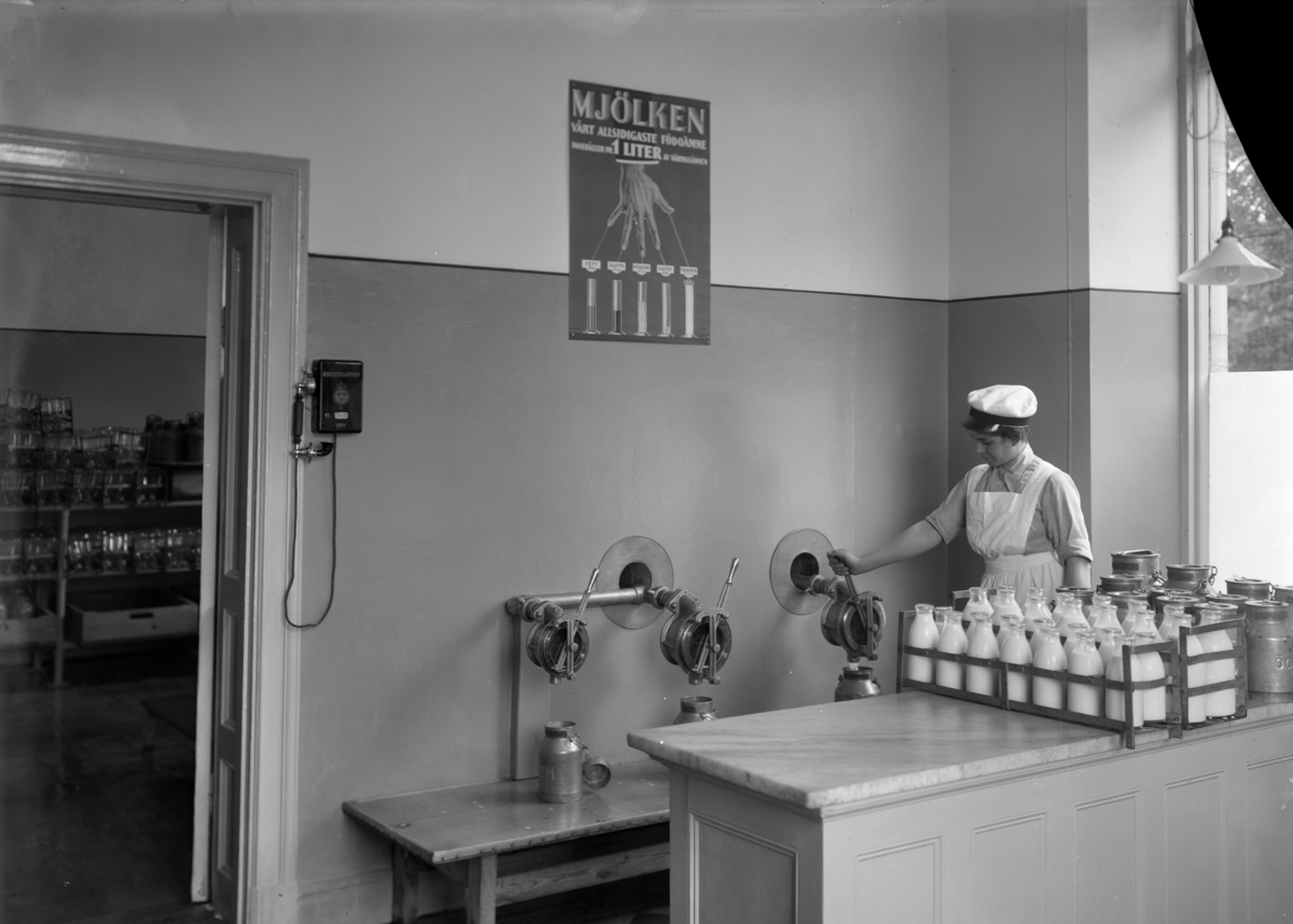 Örebro Ortens Mejeriförenings mjölkaffär, en kvinna tappar upp mjölk i mjölkaffären.