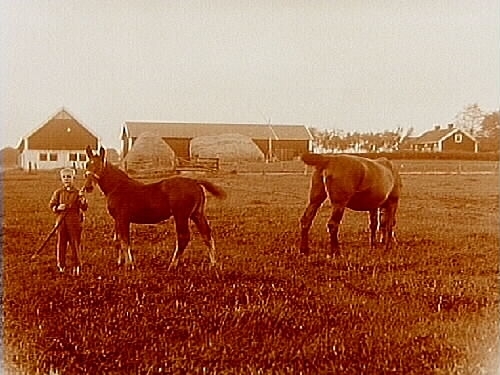 Envånings bostadshus och ekonomibyggnader, en pojke och två hästar.