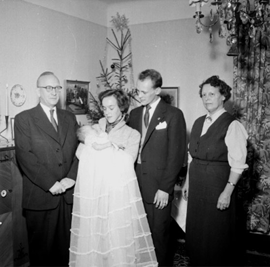 Rumsinteriör, familjegrupp fem personer, barndop.