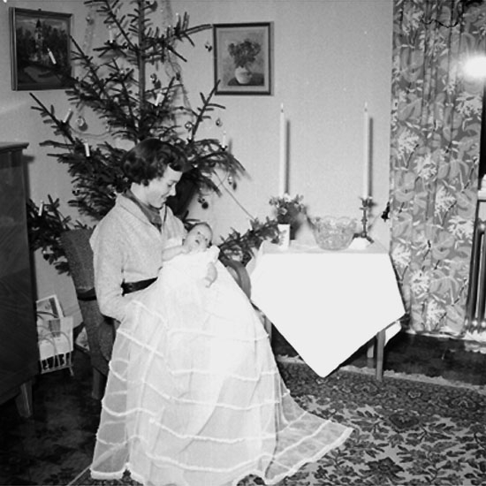 Titel: Rumsinteriör, en kvinna och en baby, barndop. Esser