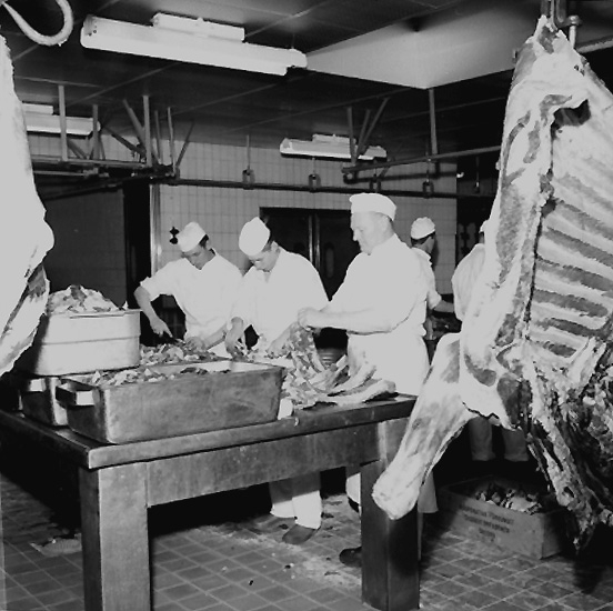 Konsum, charkuteriavdelningen, styckning av kött, fem män.