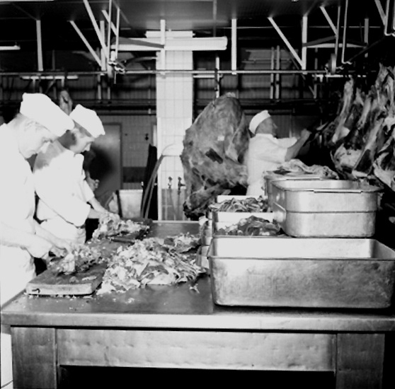 Konsum, charkuteriavdelningen, styckning av kött, tre män.