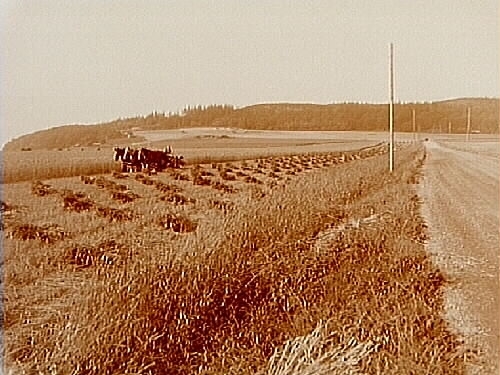 Skördebild, två hästar spända för självbindare, till höger på bilden syns turisthotellet.