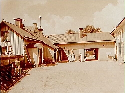 Gårdsinteriör, en och tvåvånings bostadshus, tre personer på gården.