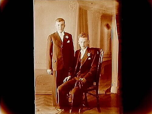 Två pojkar i konfirmationskostymer.
