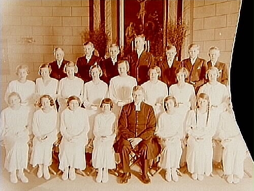 Konfirmander, 16 flickor, 7 pojkar och prästen.