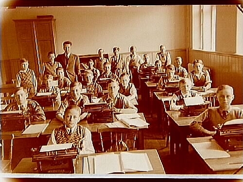 Titel: Nikolaiskolan, klassrumsinteriör, 23 pojkar med skrivmaskiner med lärare G. Reiland, klass 7, sal 6.