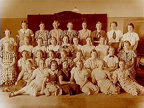 Högre Folkskolan, klassrumsinteriör, 31 flickor med lärarinna fröken Brita Söderlind, klass 2B.