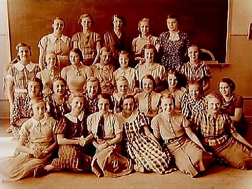 Kommunala Flickskolan, klassrumsinteriör, 25 flickor med lärarinna fröken Lichte.