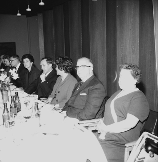 Rumsinteriör, grupp vid bordet. Personalklubben uppvaktar, Majgren avtackas.