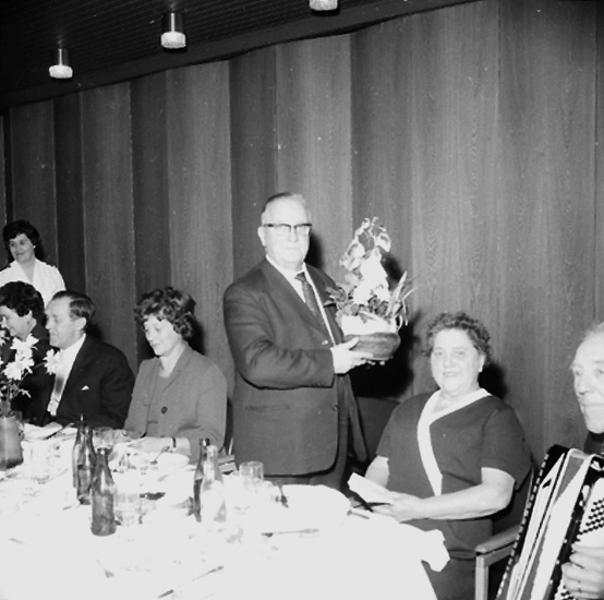 Rumsinteriör, grupp vid bordet. Personalklubben uppvaktar, Majgren avtackas.