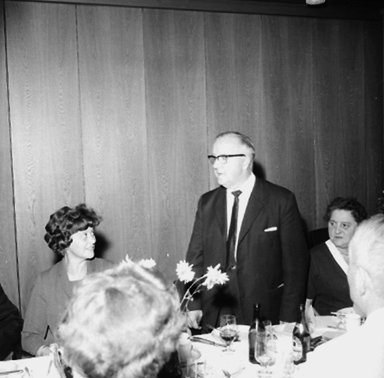 Rumsinteriör, grupp vid bordet. Personalklubben uppvaktar, Majgren avtackas.