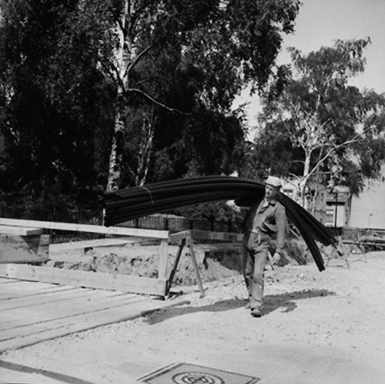 Byggnadsarbete, en man. Celllbetongkulvert rör dimension 350mm nedläggning av dräneringsrör i kulvertbotten.