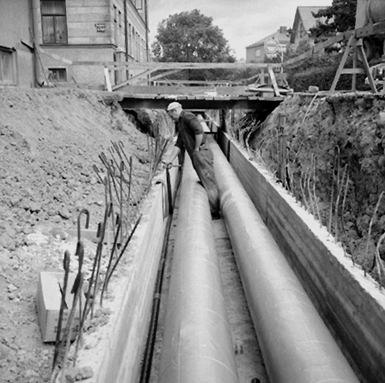 Byggnadsarbete, en man. Fjärrvärmekulvert.