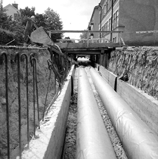 Byggnadsarbete, en man. Fjärrvärmekulvert.