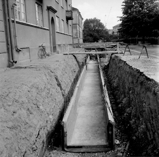 Pågående byggande av en cellbetongisolerad fjärrvärmekulvert vid Slottsgatan 39-41. Rördimensionen är 350 mm.