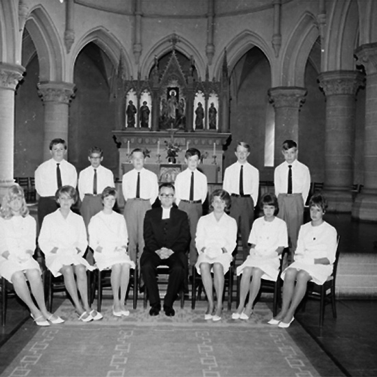 Interiör av Olaus Petrikryka, konfirmation, sex flickor, sex pojkar och en präst.