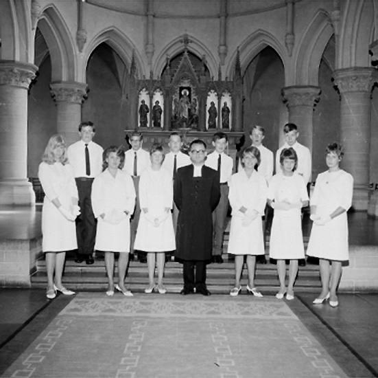 Interiör av Olaus Petrikryka, konfirmation, sex flickor, sex pojkar och en präst.