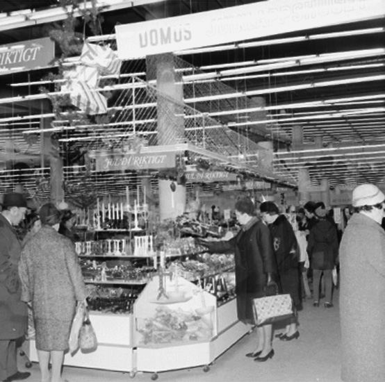 Konsum Domus, affärsinteriör, kunder och personal. Juldisk.