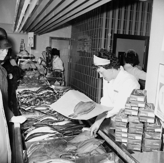 Titel: Konsum Domus, affärsinteriör, fiskdisken, kunder och personal.