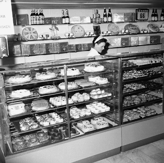 Konsum Domus, affärsinteriör, bröddisken, en kvinna.