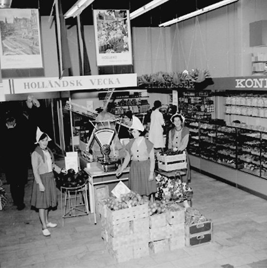 Konsum Domus, affärsinteriör, kunder och personal. Holländsk vecka.