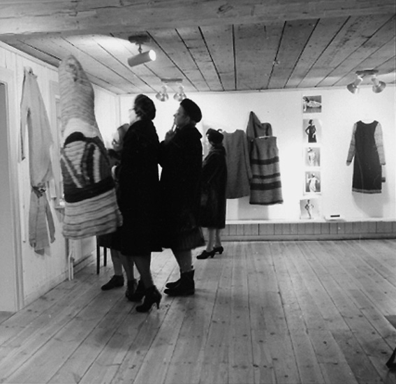 Klädutställning i Wadköping, interiör av utställningssalen, tre kvinnor.