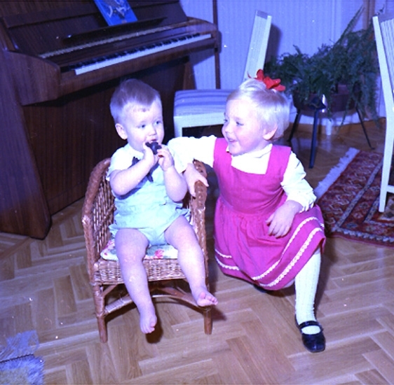 Titel: Rumsinteriör, två barn vid pianot. Bertil Larsson