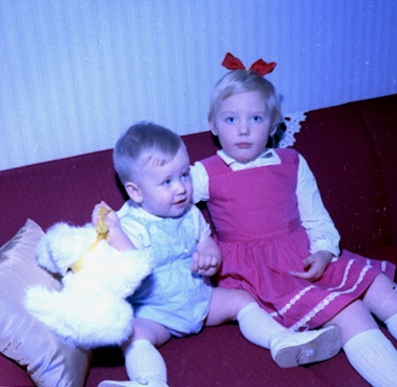 Rumsinteriör, två barn i soffan.