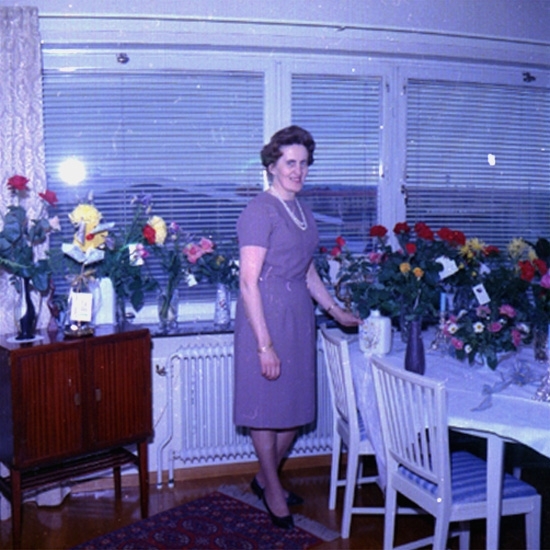 Titel: Rumsinteriör, en kvinna. Eivor Johansson på födelsedagen.