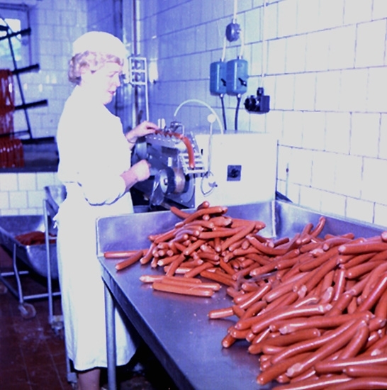 Titel: Robertsons Charkuteri, interiör, korvtillverkning, en kvinna.
