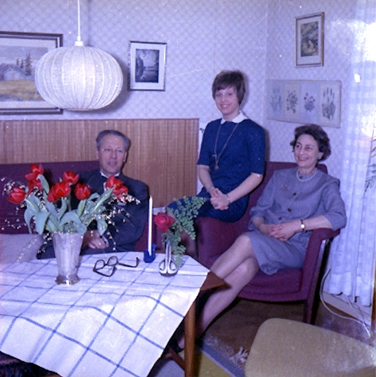 Rumsinteriör, familjegrupp tre personer, födelsedag.