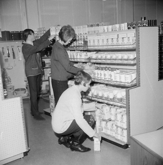 Titel: Västra Yrkesskolan, detaljhandel, interiör, tre personer.