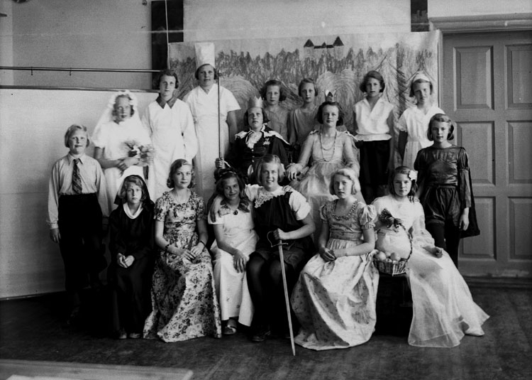Vasaskolan, skolteater, 17 utklädda flickor.