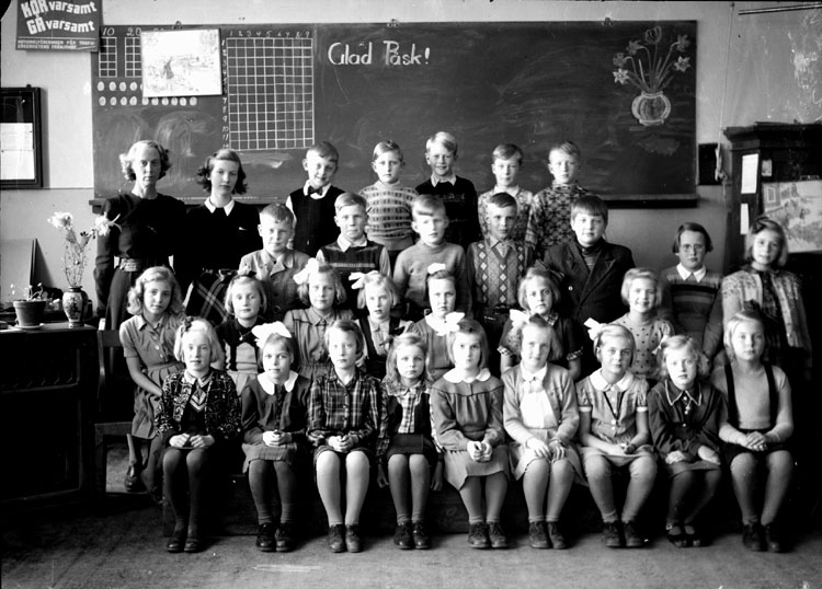Titel: Vasaskolan, klassrumsinteriör, 19 flickor, 10 pojkar och lärarinna fru Ella Lindkvist. Klass 2, sal 3.
