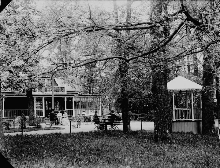 Stora Holmen, konditoriservering, en och en halvvånings bostadshus med inredd vind, stor glasad veranda, balkong och brutet plåttak.