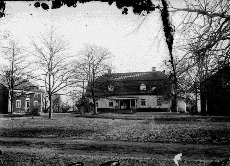 Bostadshus, grupp nio personer framför huset.