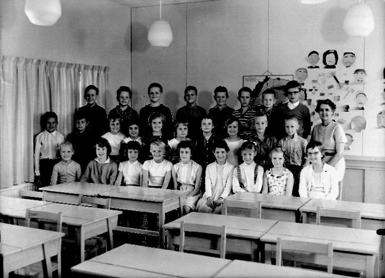 Klassrumsinteriör, 27 skolbarn med lärarinna.