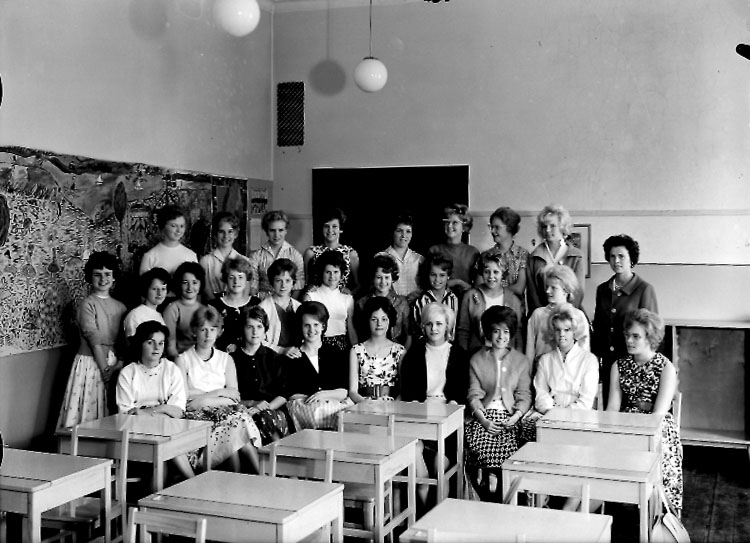 Klassrumsinteriör, 27 flickor med lärarinna.