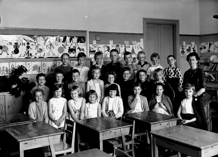 Klassrumsinteriör, 24 skolbarn med lärarinna.