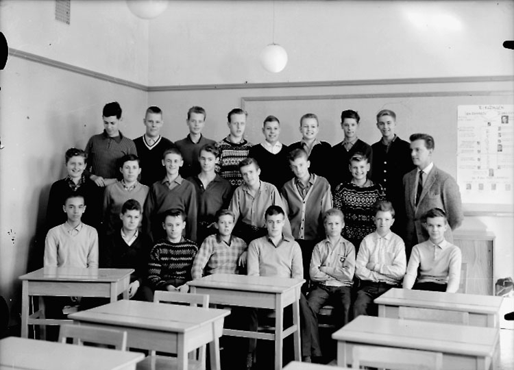 Engelbrektsskolan, klassrumsinteriör, 23 pojkar med lärare Arne Pettersson.