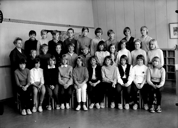 Vasaskolan, klassrumsinteriör, 29 skolbarn med lärarinna fröken Margit Svensson.