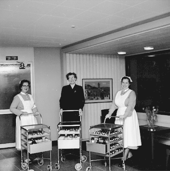 Österängs Ålderdomshem, interiör, tre kvinnor ur personalen.