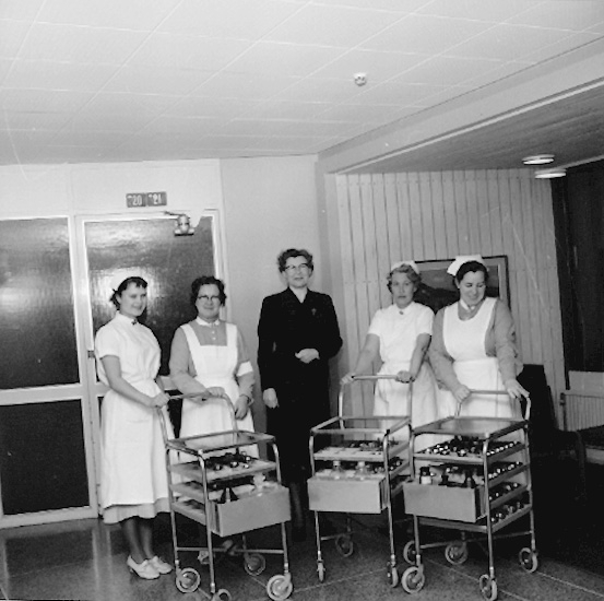 Österängs Ålderdomshem, interiör, fem kvinnor ur personalen.