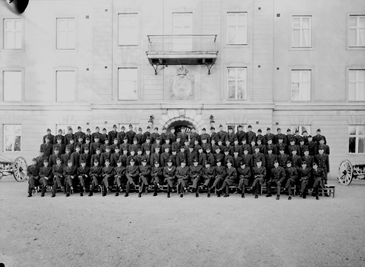 Titel: Livregementetet I3, soldatgrupp. Kasernbyggnad i bakgrunden. Kapten Fransson