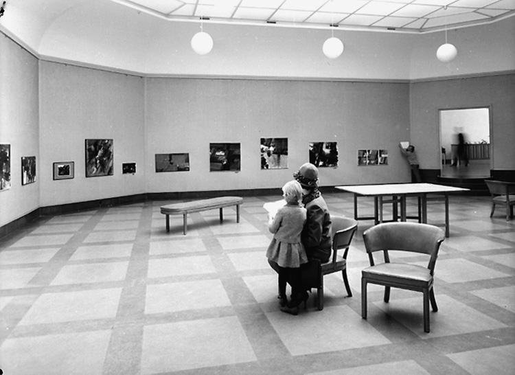 Tomas Nordbäcks utställning på Konsthallen, interiör av utställningssalen, en kvinna och en flicka.