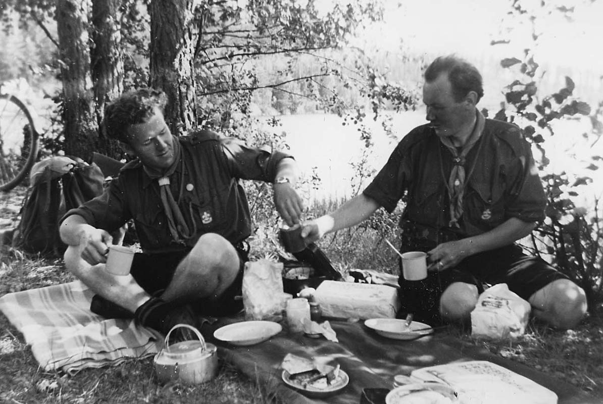 Två män. Gunnar Runvik och Thure Elgåsen vid Fagertärn. Teet serveras.